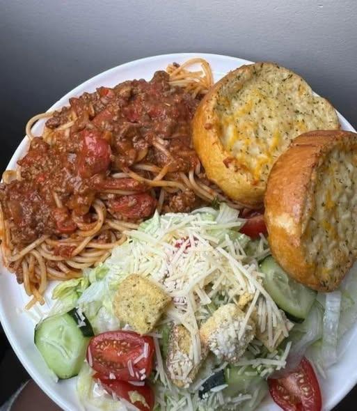 Hearty Spaghetti with Garden Salad & Garlic Bread